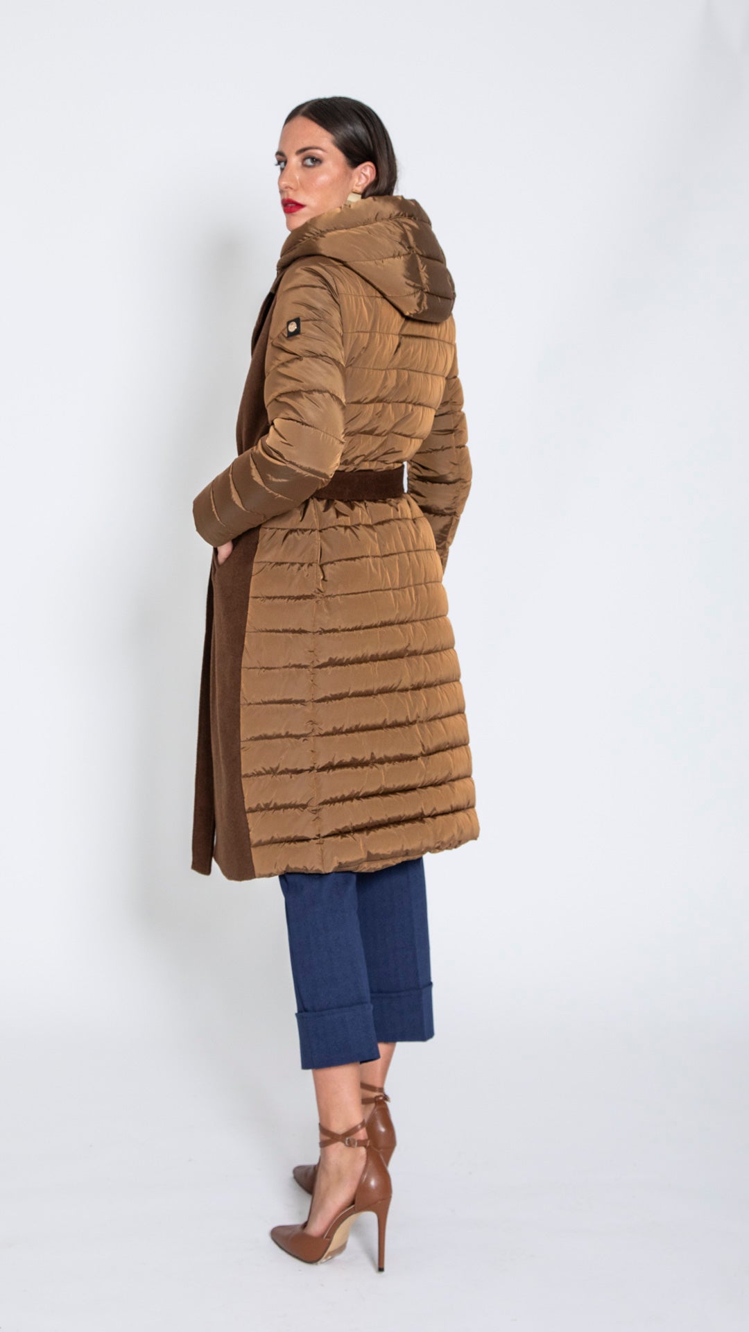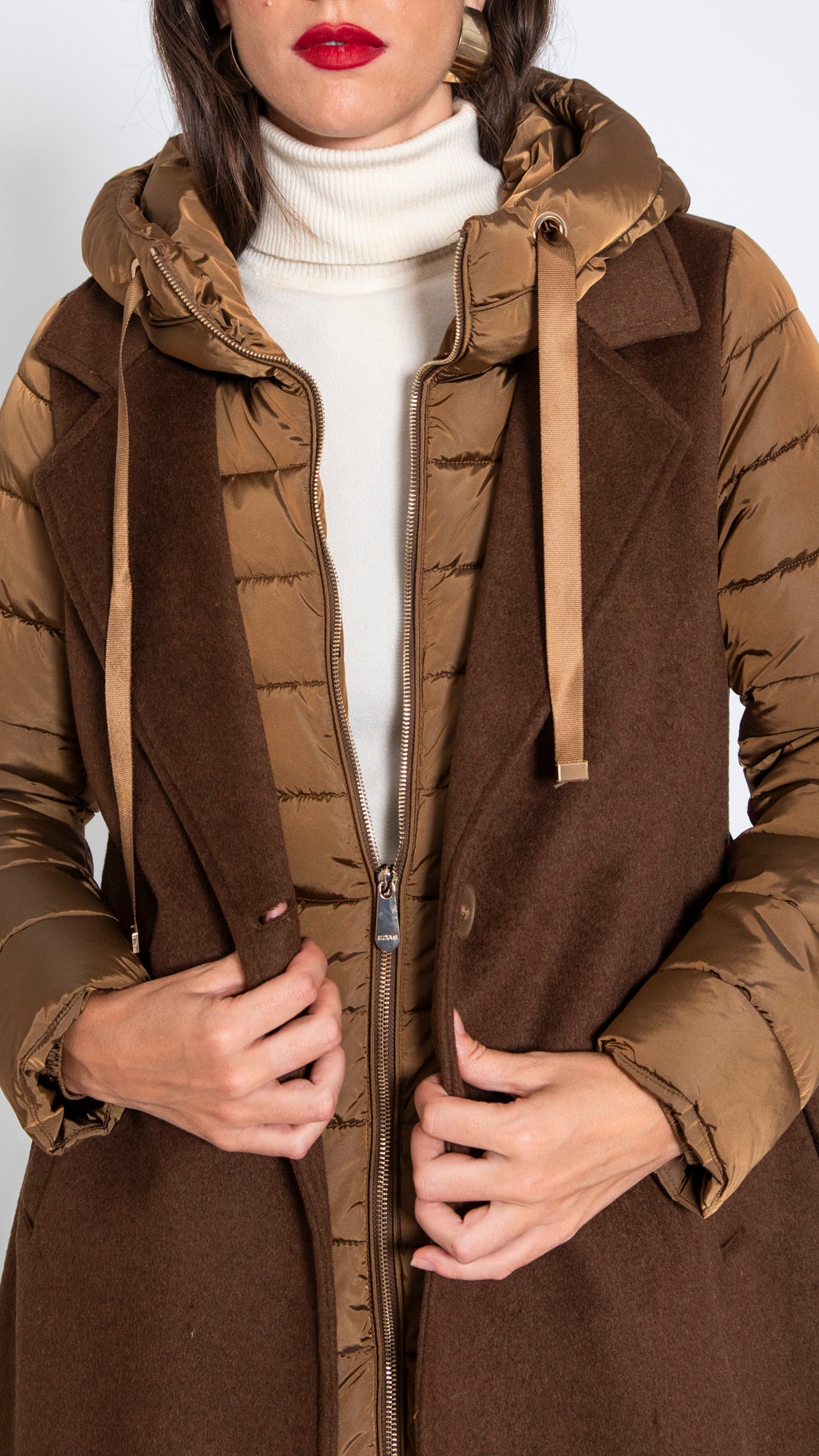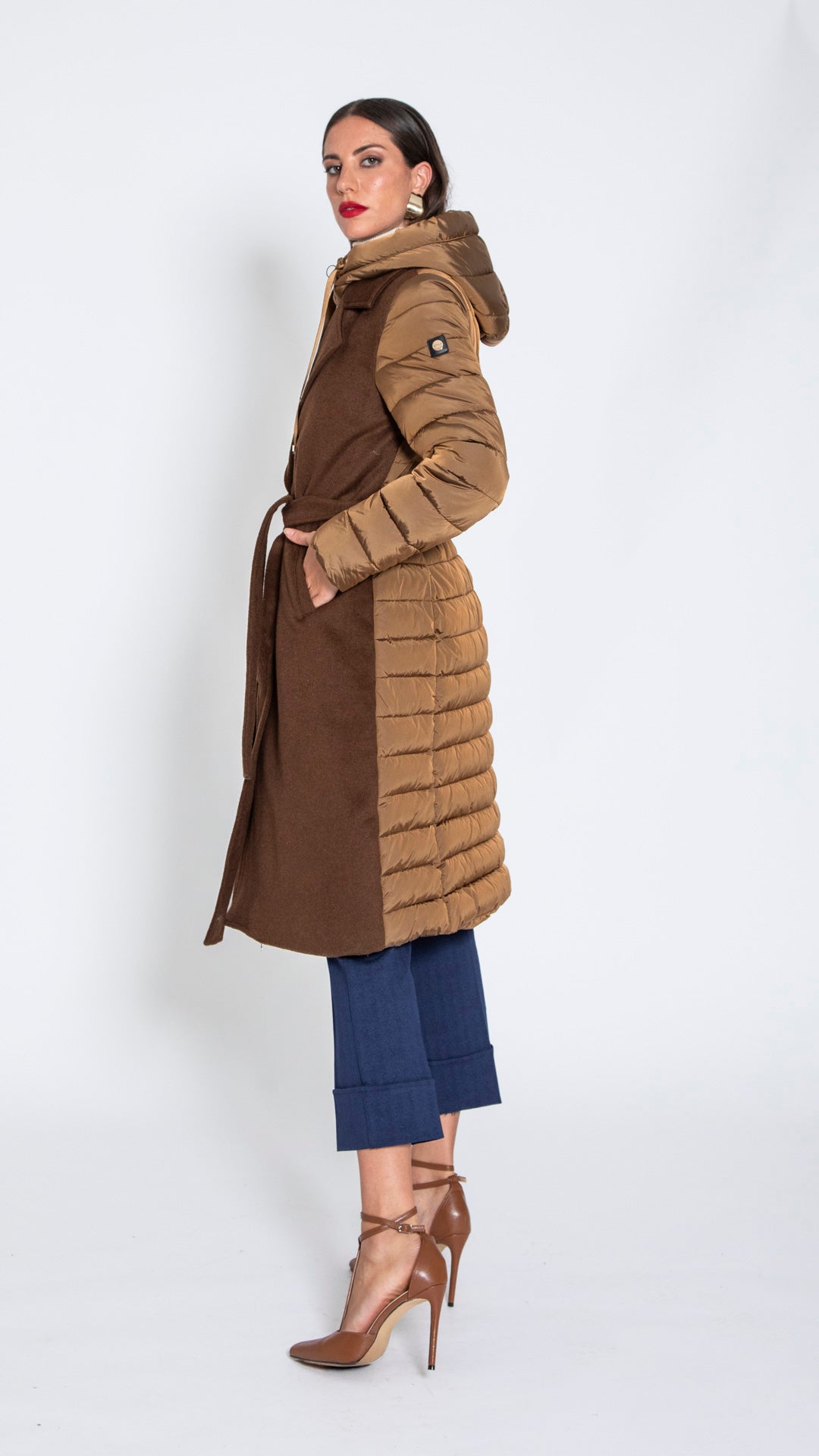 Cappotto lungo con inserti trapuntati in nylon. Linea moderna e sofisticata, perfetta per affrontare la stagione fredda con stile. Dettagli curati e materiali di qualità per un look raffinato e contemporaneo