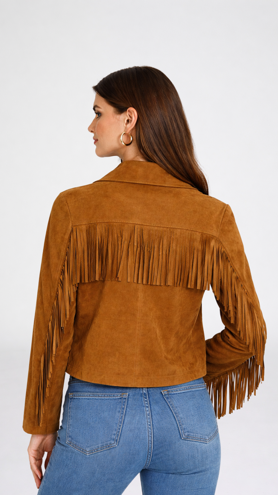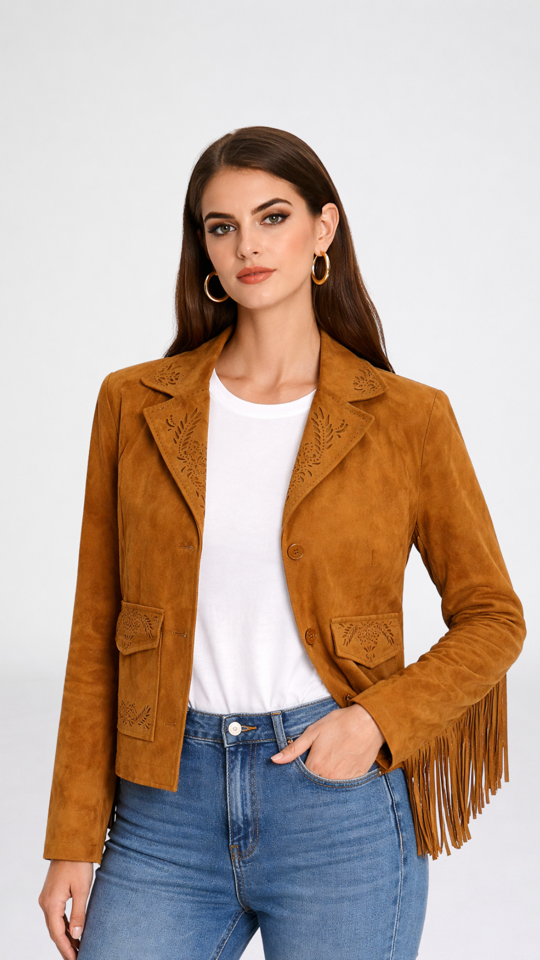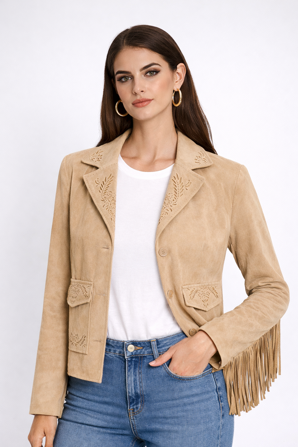 Giacca in dainetto. Tessuto morbido effetto suede, piacevole al tatto. Linea dritta e femminile. Scollo con revers. Maniche lunghe. Chiusura frontale. Tasche funzionali. Vestibilità regolare. Design elegante e contemporaneo.