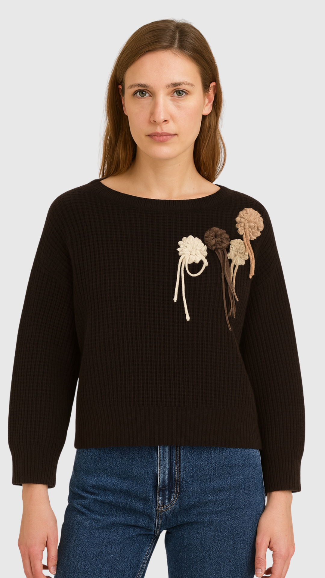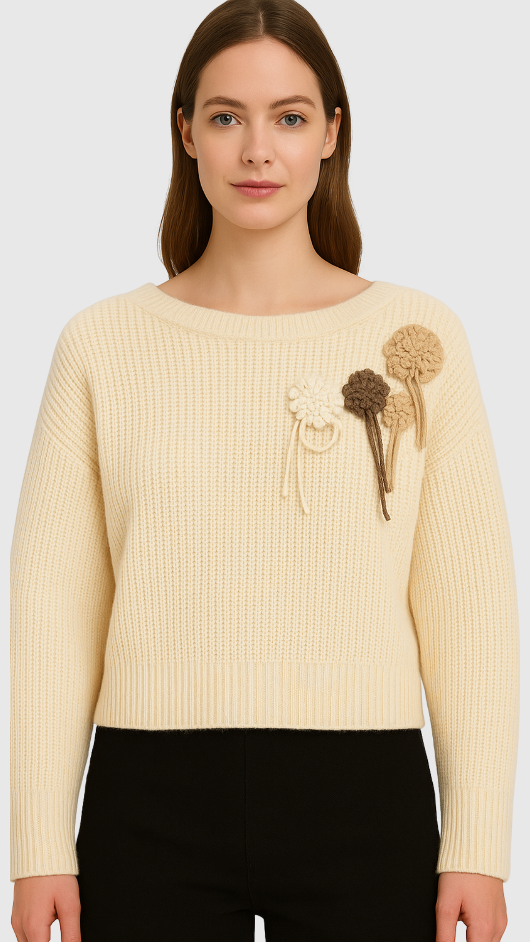 Dettagli preziosi e lavorazione ricercata.La maglia punto pannocchia con fiocchi che unisce eleganza e dolcezza