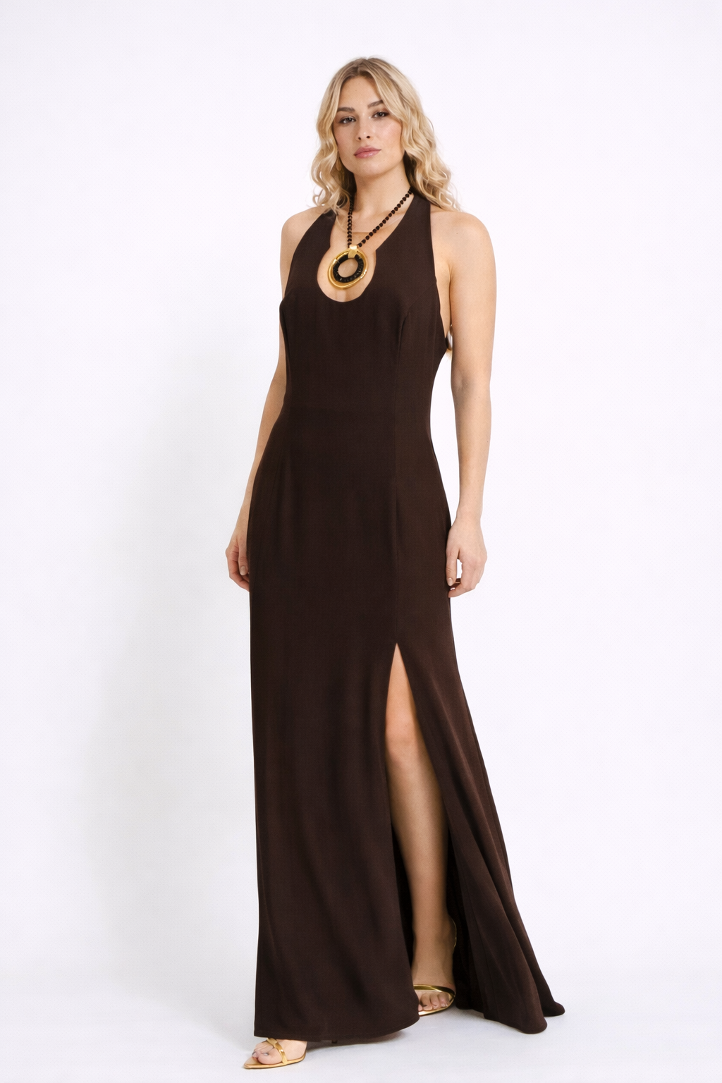Abito sirena con accessorio collana in cadì. Tessuto fluido e strutturato. Design aderente con fondo svasato. Lunghezza lunga. Scollo rotondo. Senza maniche. Vestibilità regolare. Accessorio collana decorativo applicato. Linea elegante e femminile.