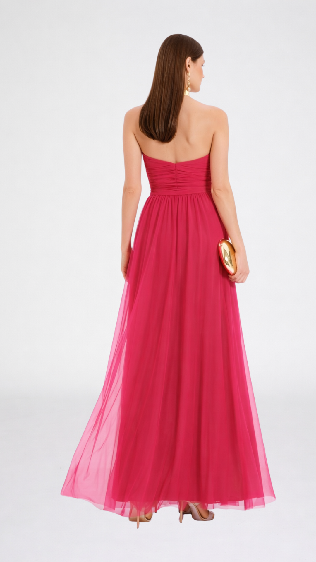 Abito bustier drappeggiato in tulle unito. Tessuto leggero e impalpabile. Design aderente. Scollo a cuore. Senza spalline. Vestibilità regolare. Drappeggio decorativo sul corpino. Lunghezza midi. Linea elegante e femminile. Finiture curate.