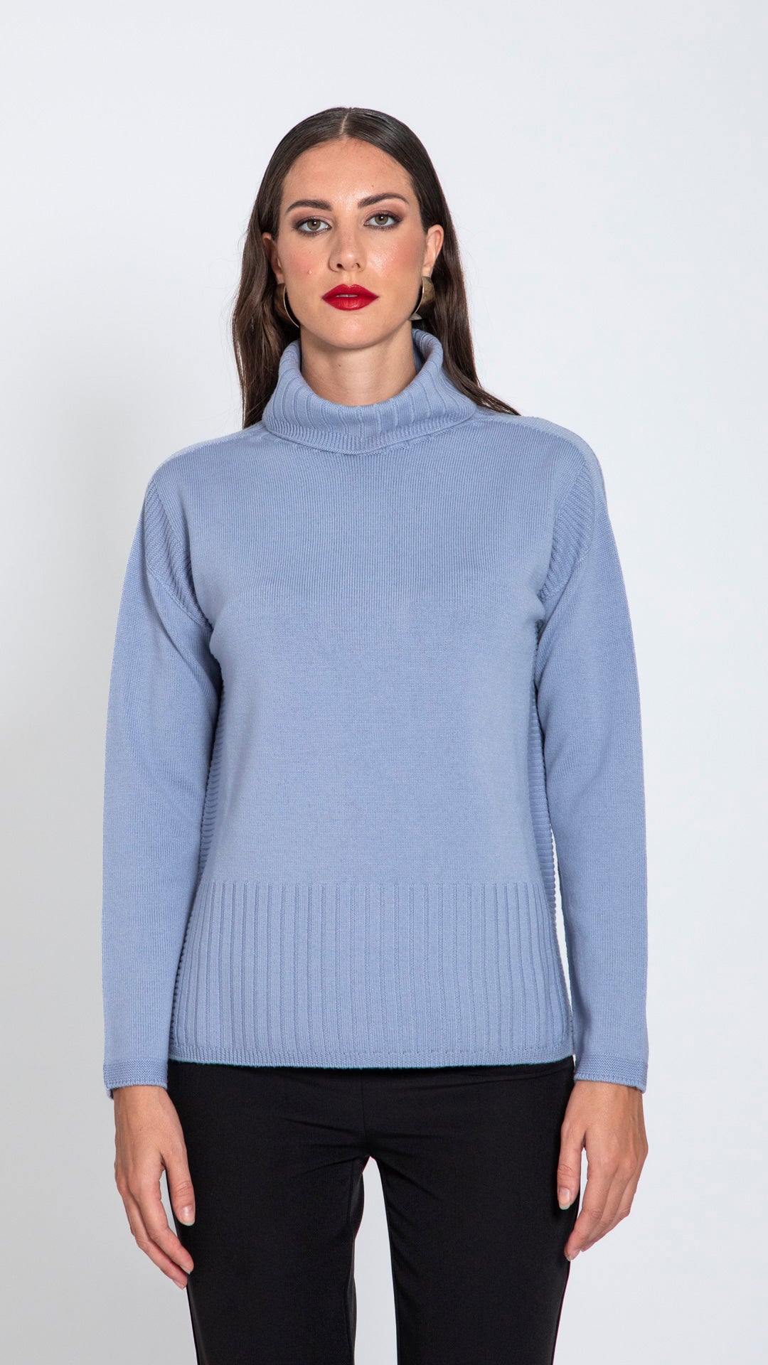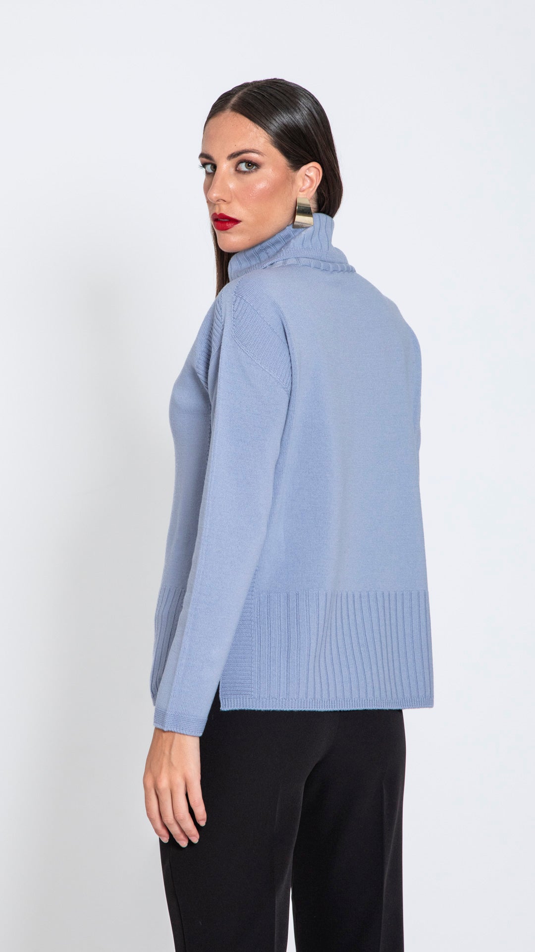 Maglia a coste con collo alto e spacchi laterali. Linea morbida e femminile, perfetta per look raffinati e versatili