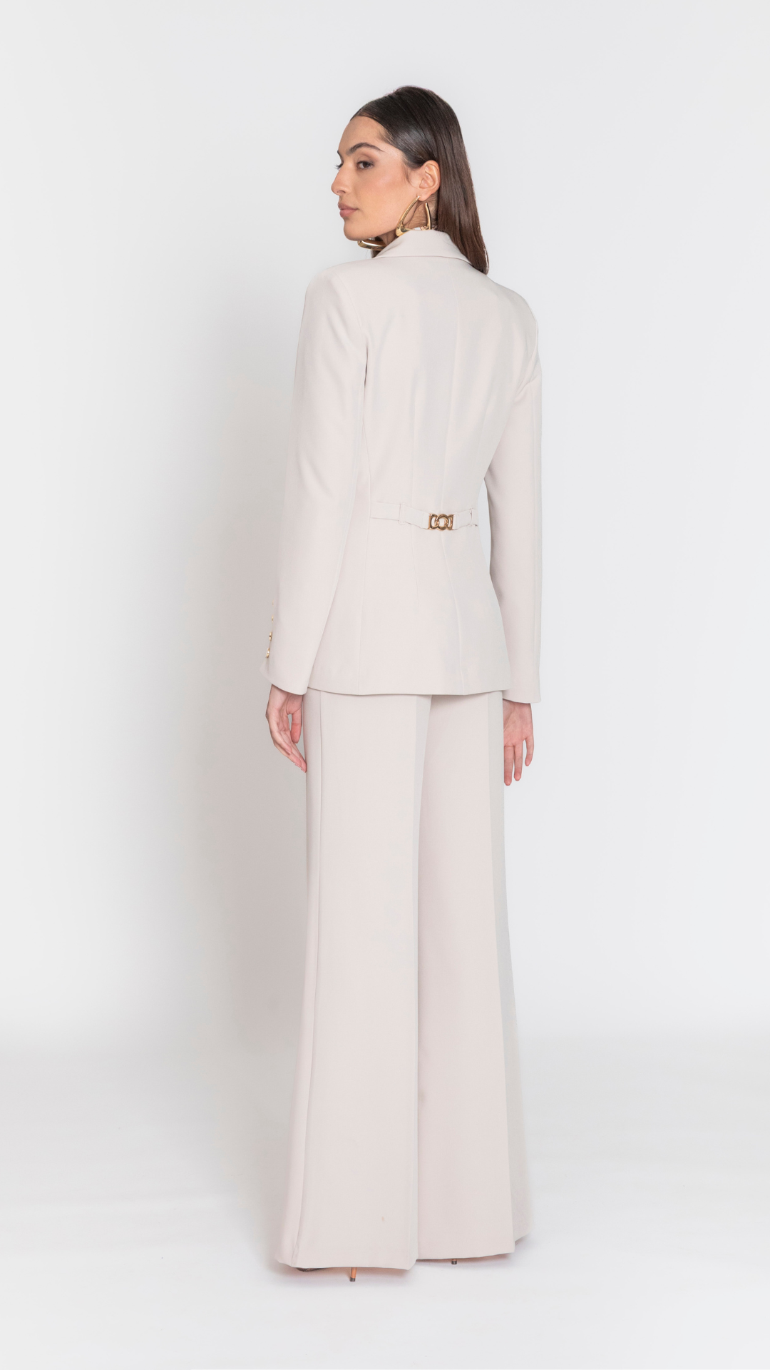 Un capo dal design curato e distintivo. Questa giacca si caratterizza per la fibbia posta sul retro, che regala un effetto modellante e aggiunge un tocco di originalità al look. La linea sartoriale valorizza la figura, combinando stile classico e dettagli moderni