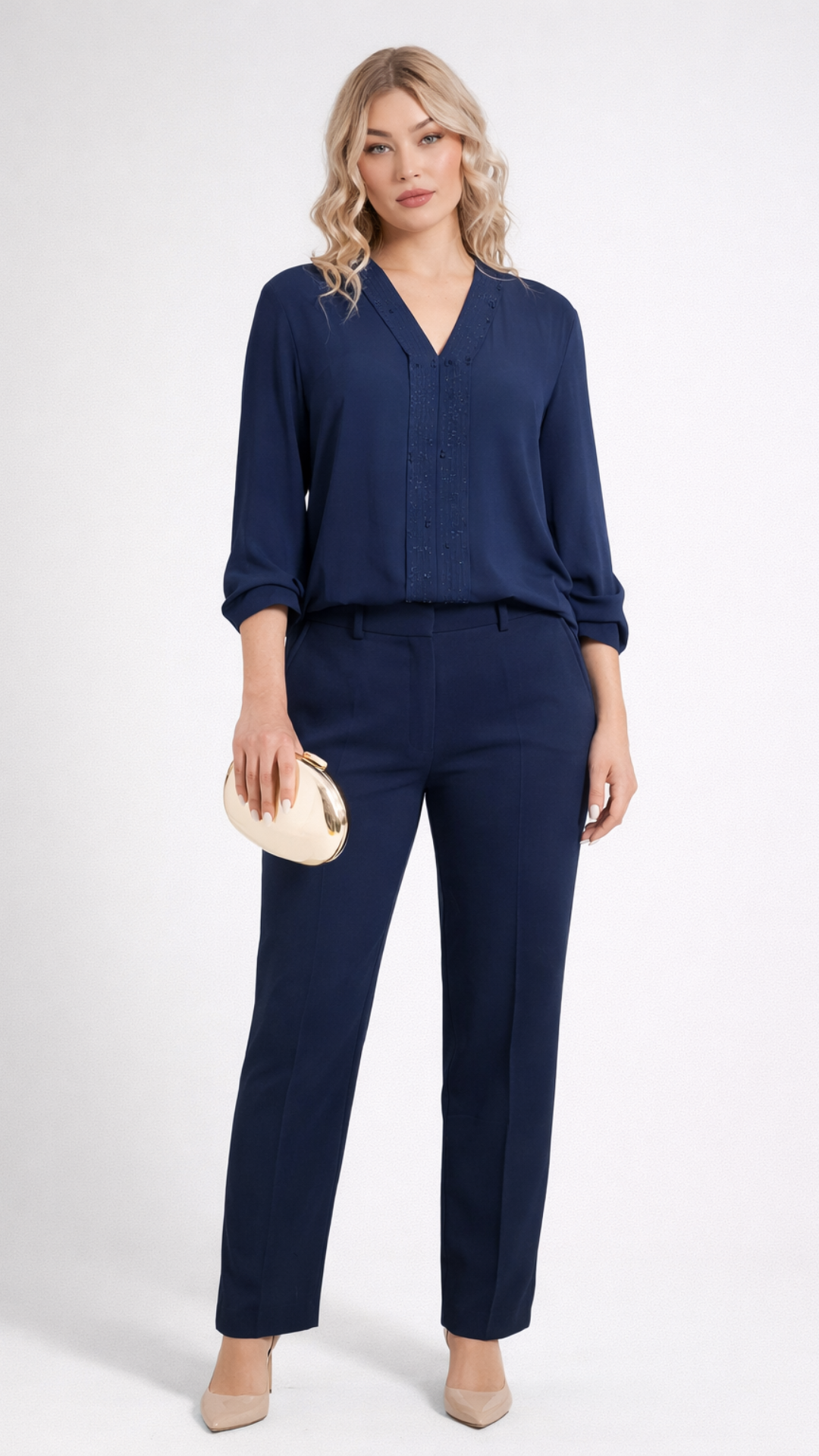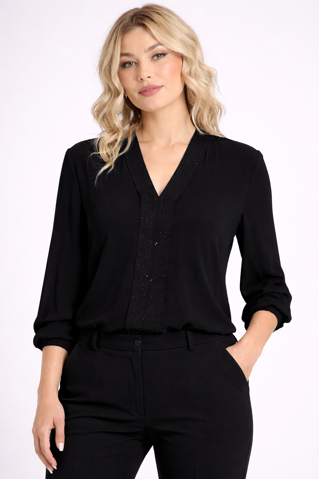 Casacca con collo di strass. Tessuto leggero e fluido. Design dritto. Scollo rotondo con applicazione strass. Maniche corte. Vestibilità regolare. Linea elegante e luminosa. Finiture curate.