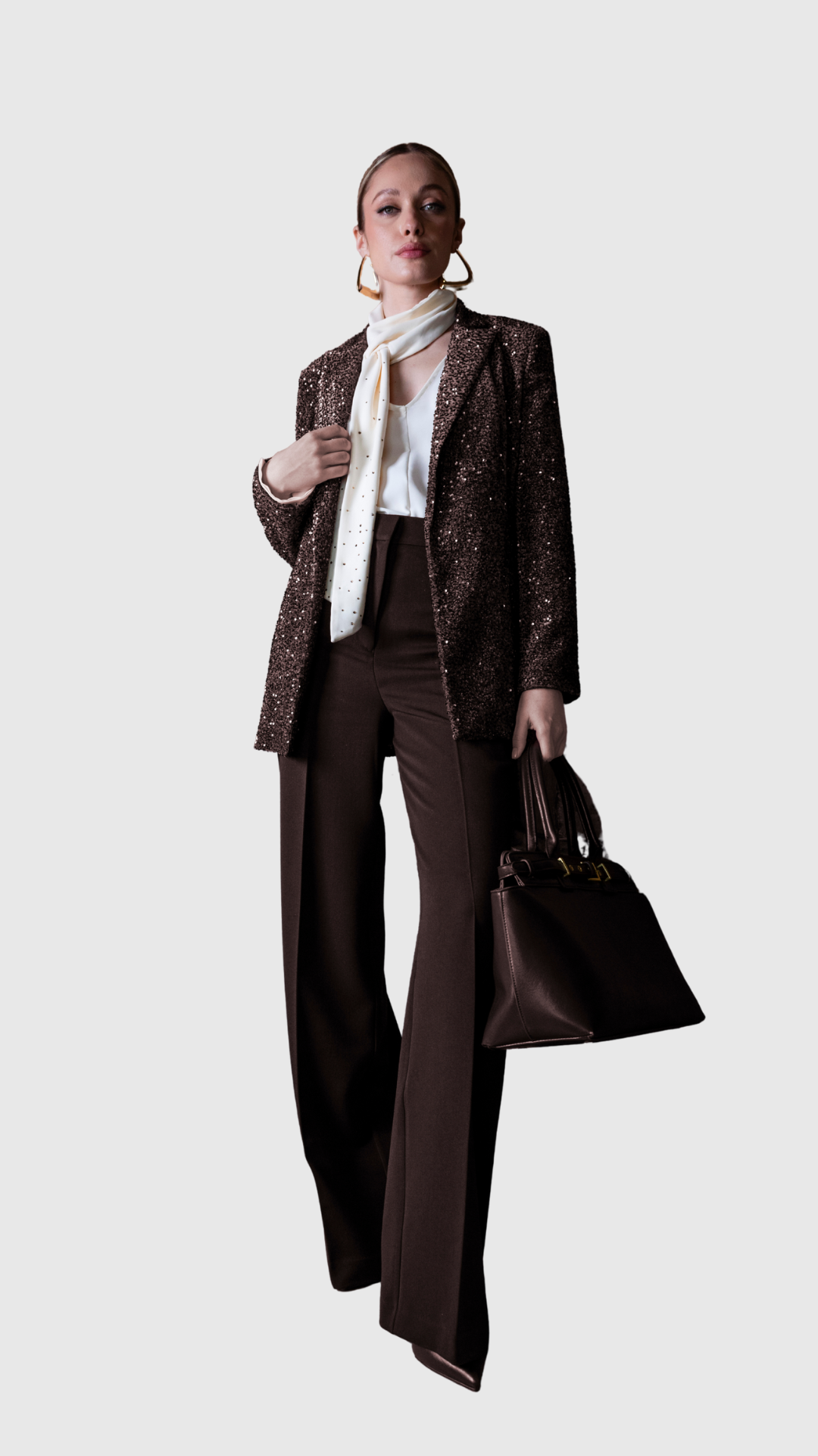 Casacca elegante con sciarpa impreziosita da strass oro, un dettaglio luminoso che dona raffinatezza e unicità al capo. Realizzata in tessuto fluido e confortevole, è perfetta per occasioni speciali o per aggiungere un tocco glamour agli outfit quotidiani