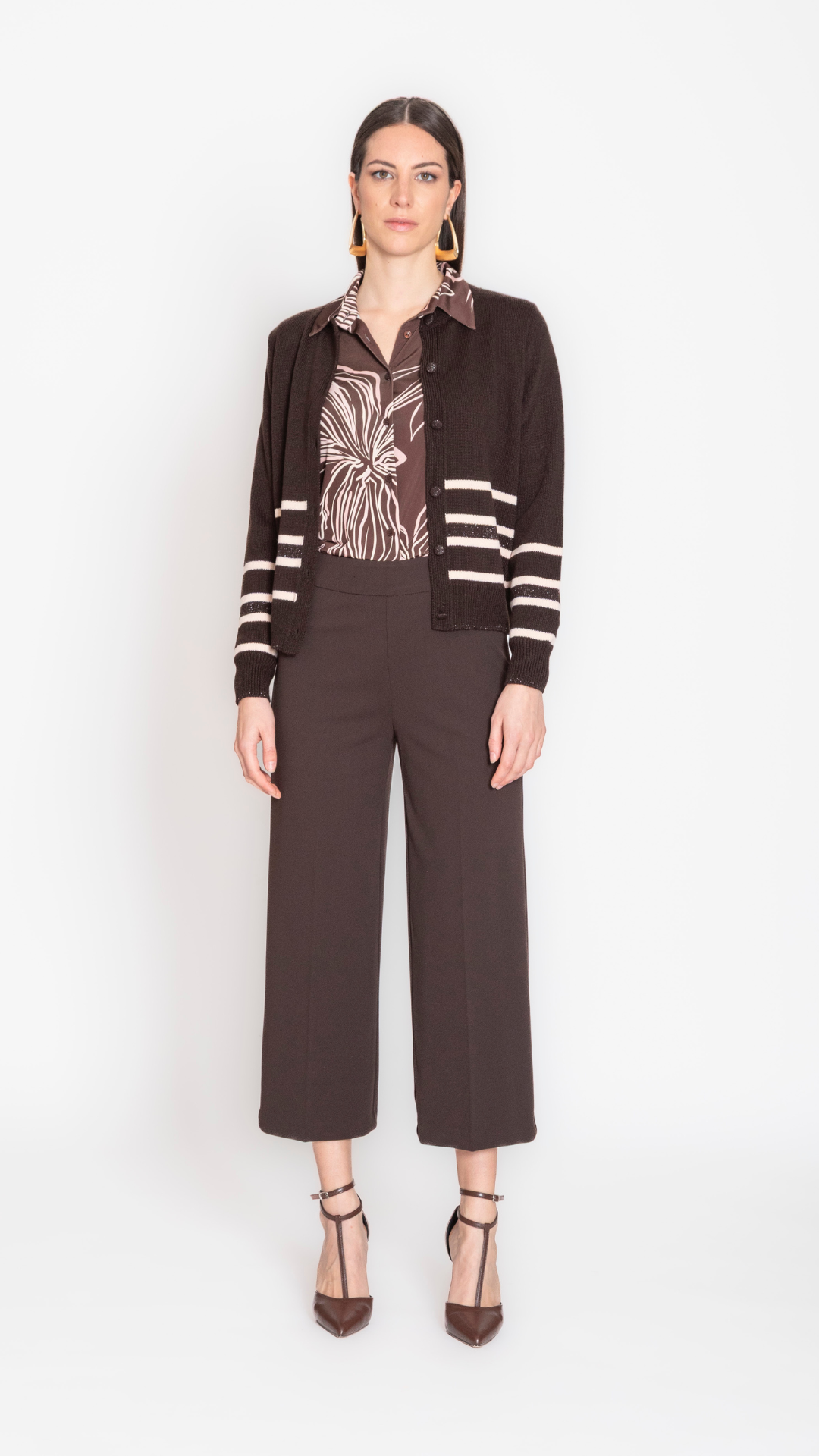 Giacchino in maglia leggera arricchito da righe con filato lurex, per un effetto luminoso ma discreto. Il taglio corto e versatile lo rende perfetto da abbinare a pantaloni a vita alta o gonne, sia per il giorno che per la sera. Un capo facile da indossare, ma capace di fare la differenza