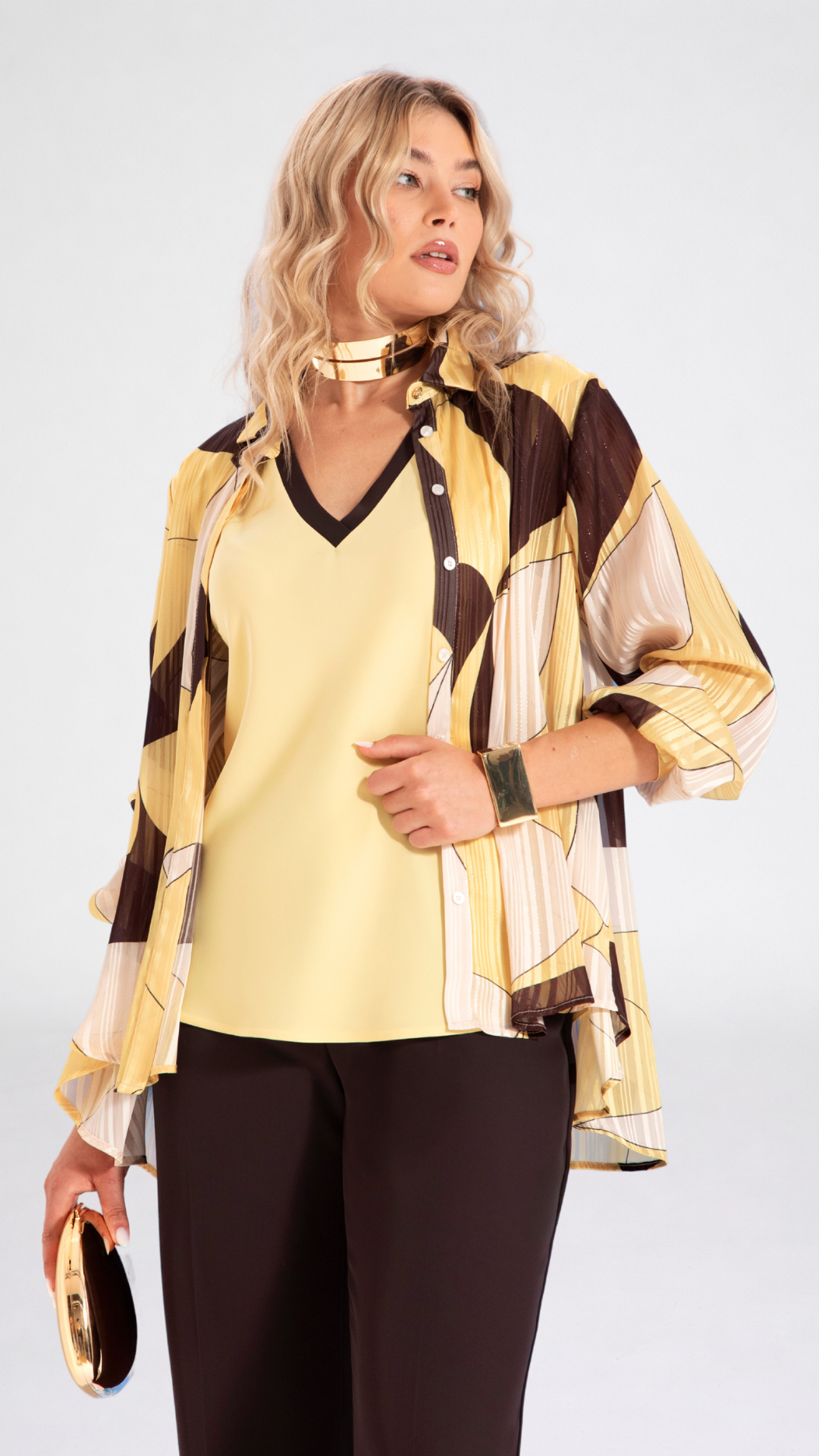 Giacca camicia in stampa geometrica. Tessuto leggero e fluido. Design dritto. Colletto classico. Maniche lunghe. Vestibilità regolare. Motivo geometrico all over. Linea elegante e moderna. Finiture curate. Chiusura frontale con bottoni.