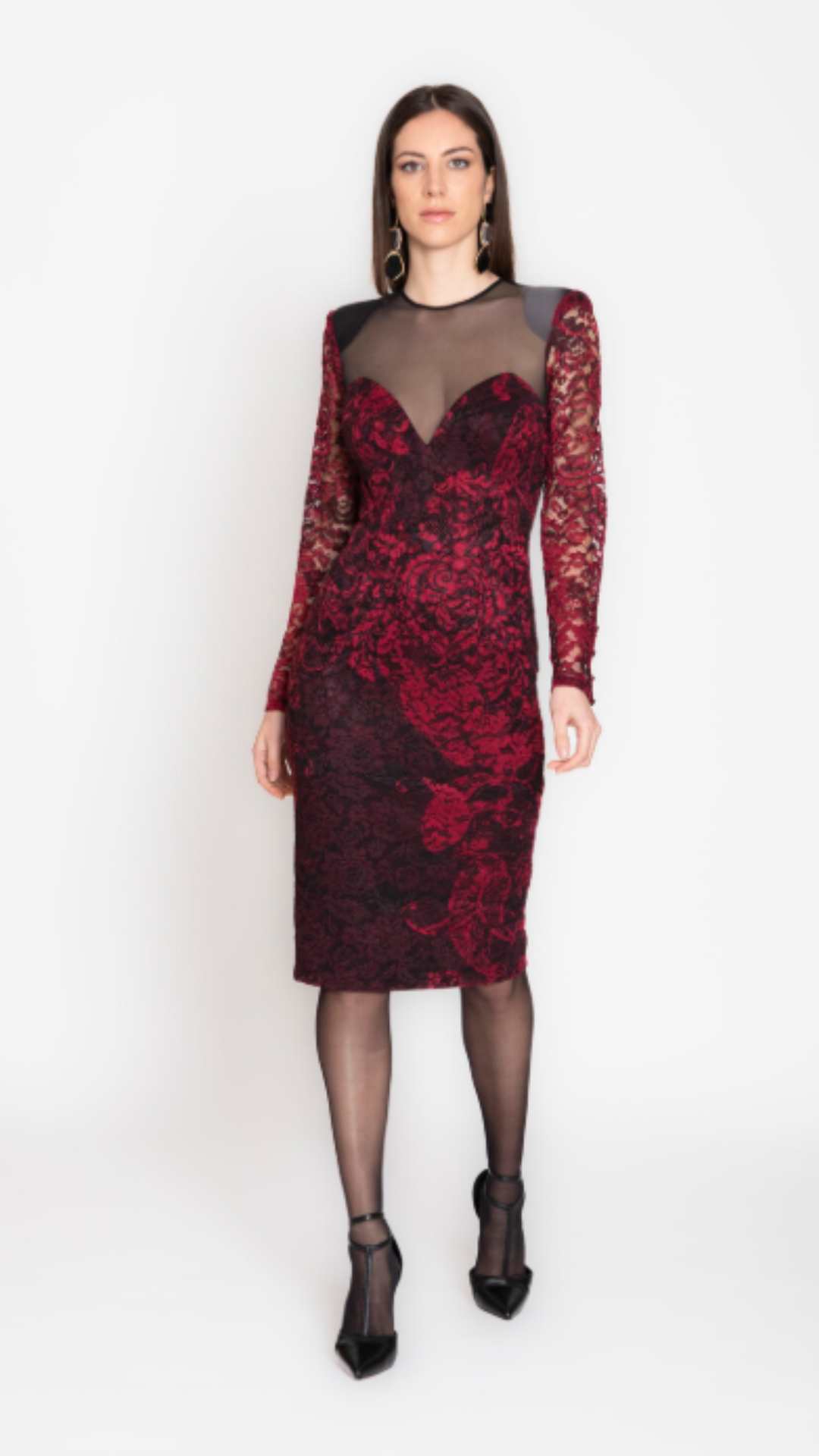 Abito in pizzo stampato dal fascino romantico. Linee fluide e dettagli delicati per un’eleganza senza tempo