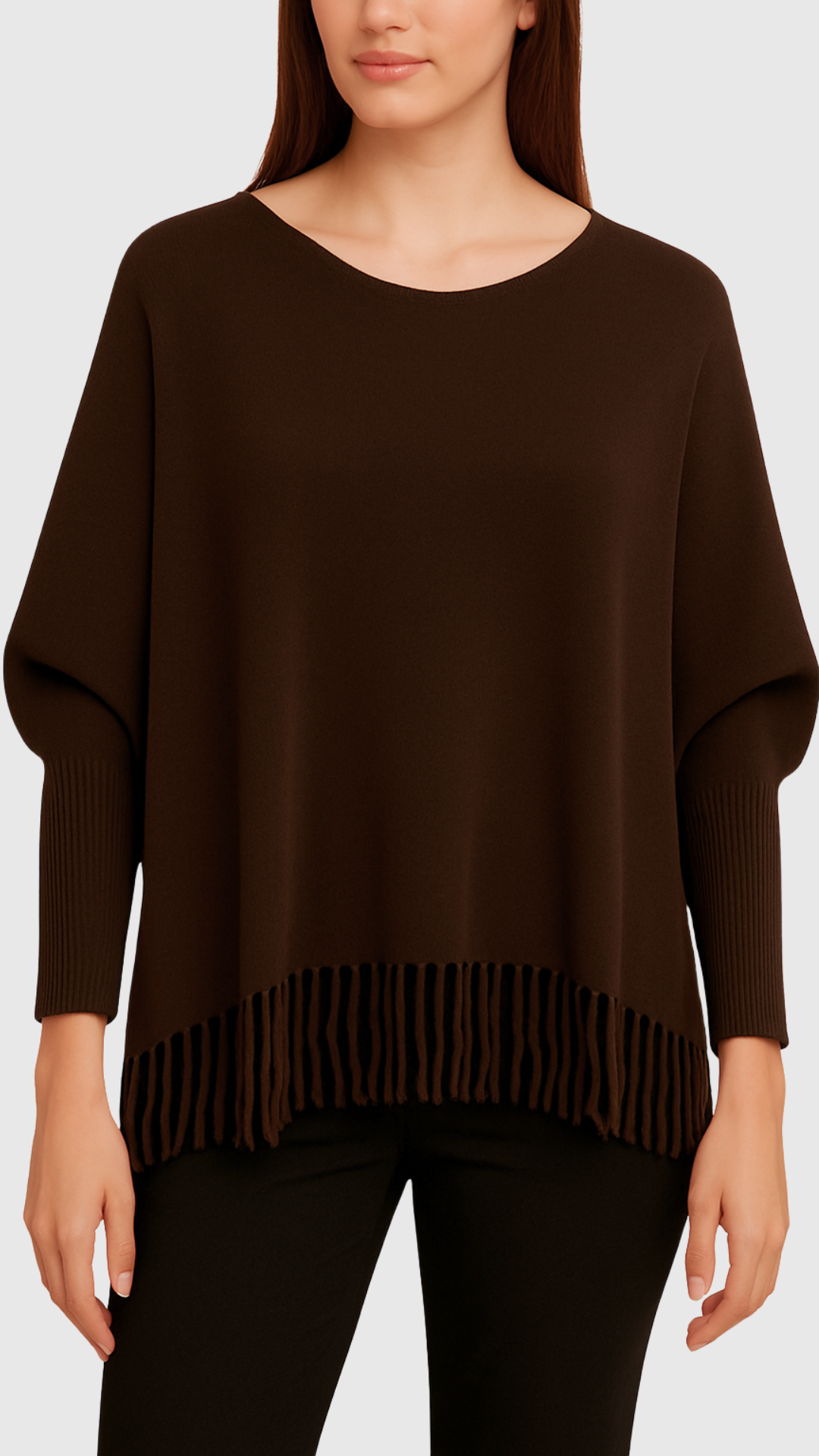 Maglia modello pipistrello dal design fluido e contemporaneo, impreziosita da frange decorative che aggiungono movimento e personalità al capo