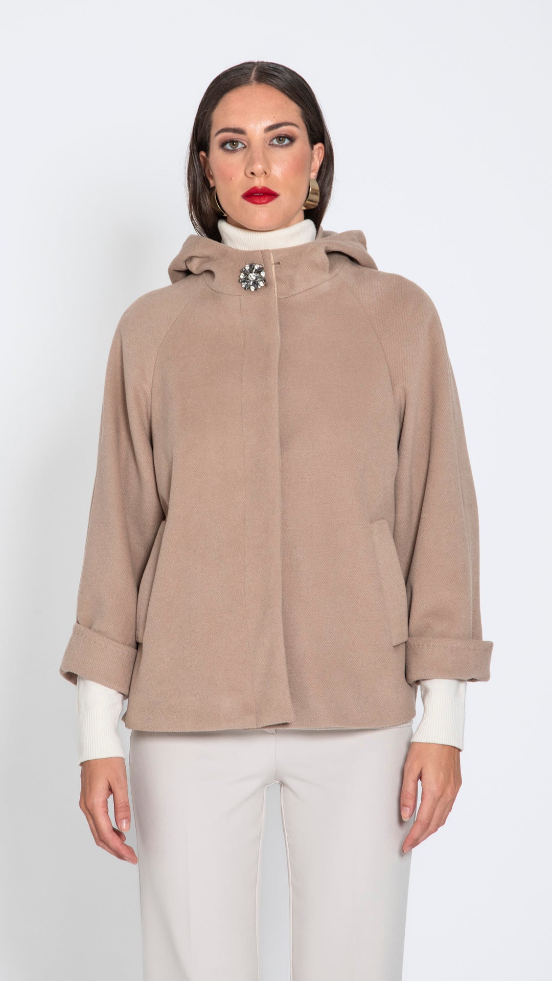 Elegante e versatile, la cappa a trapezio con cappuccio unisce comfort e stile in un capo pratico e raffinato. La linea morbida valorizza la silhouette, mentre il cappuccio aggiunge un tocco contemporaneo