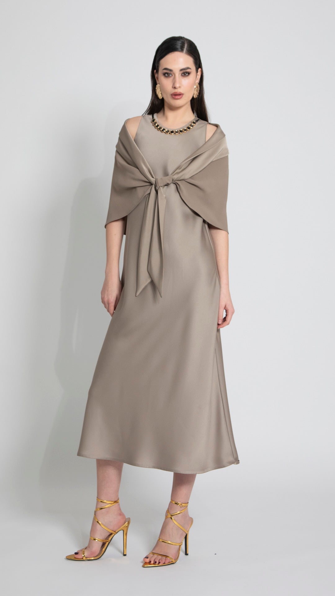 Coprispalle in enversatin. Tessuto fluido e luminoso. Design corto. Maniche lunghe. Vestibilità regolare. Linea elegante e raffinata. Finiture curate. Chiusura senza bottoni.