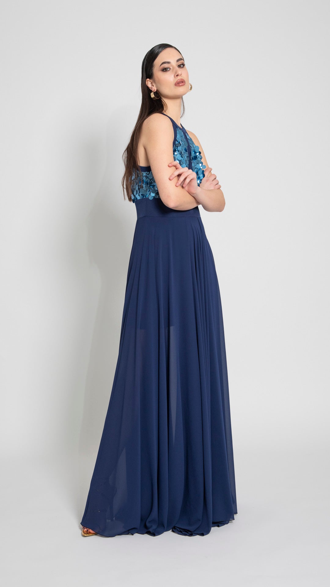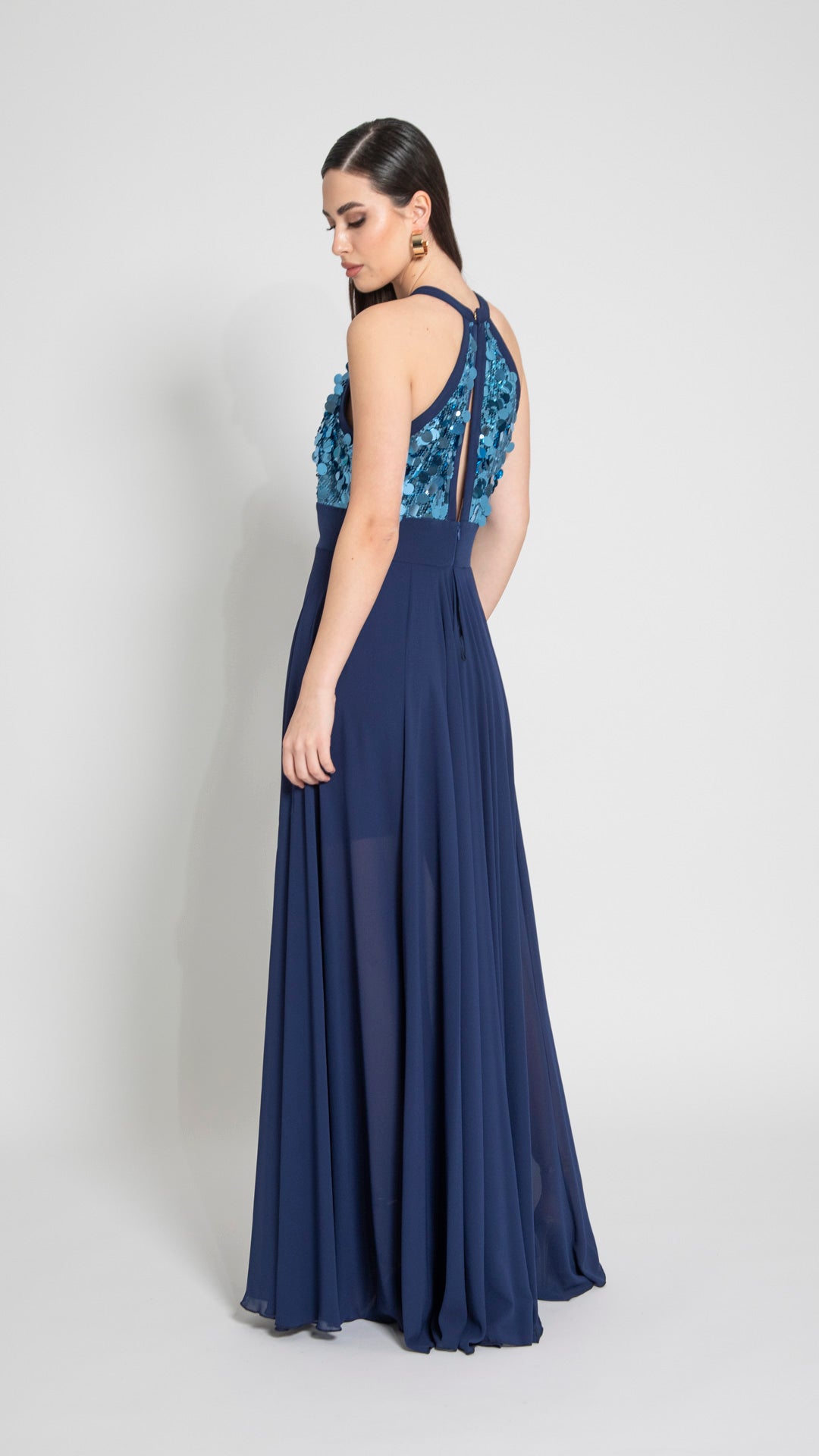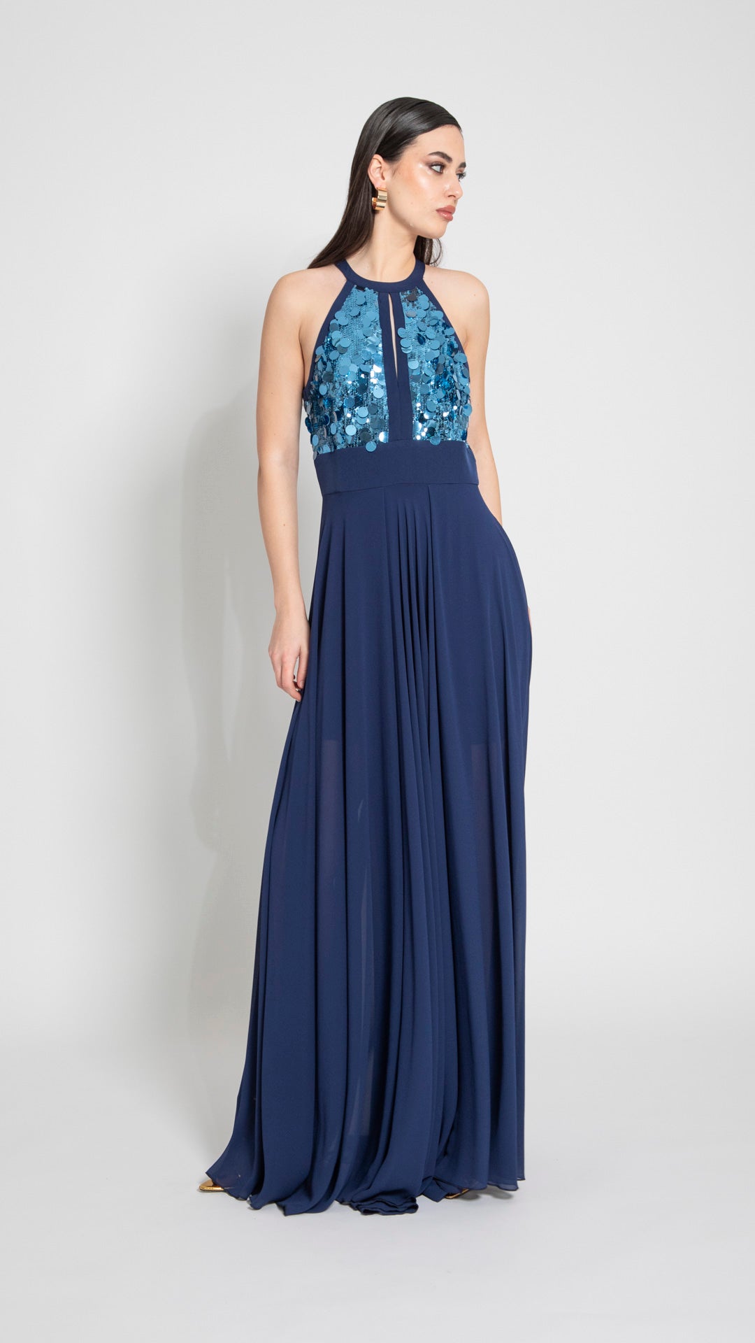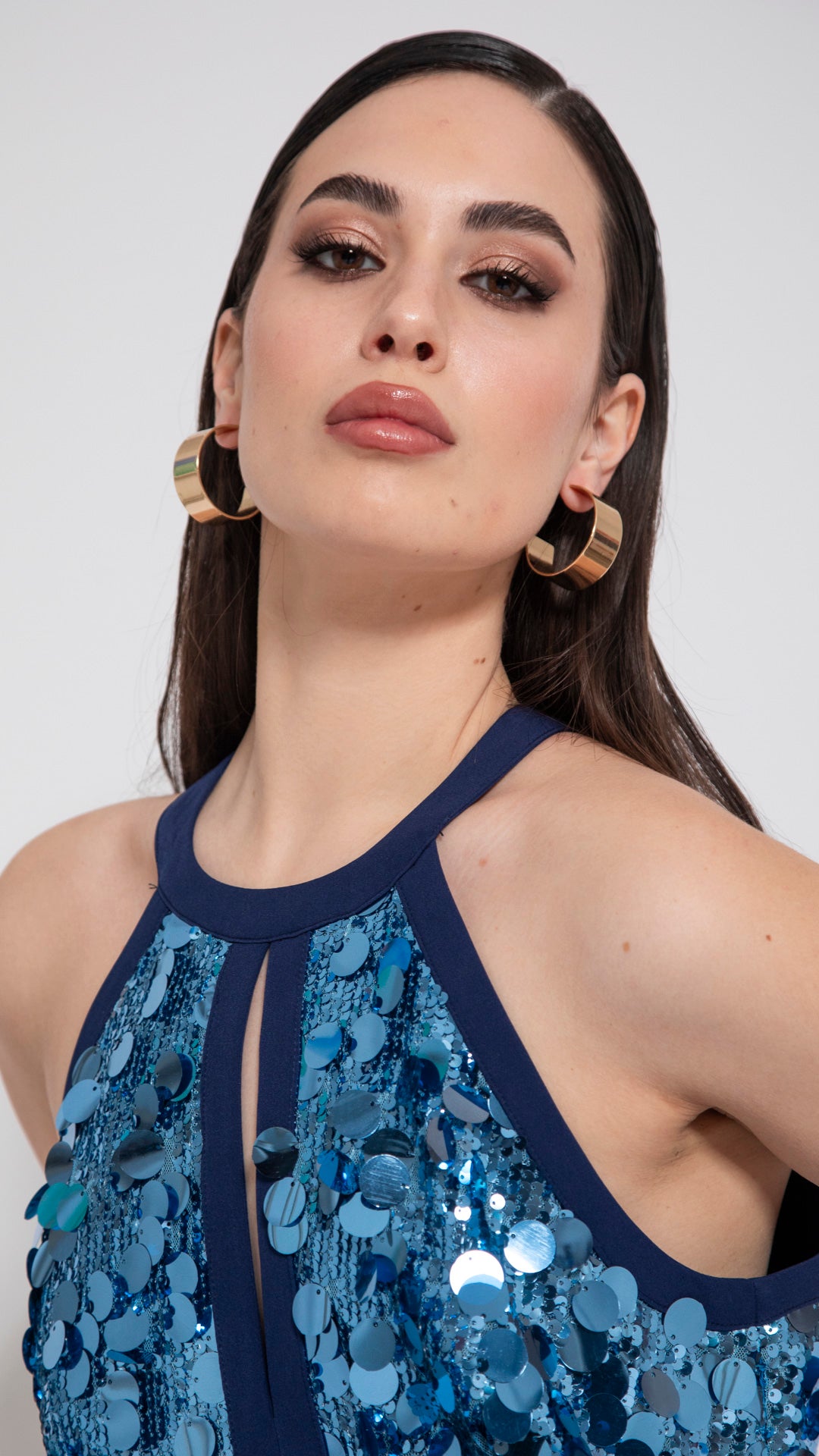 Abito lungo inserti maxi paillettes. Tessuto fluido e leggero. Design aderente. Lunghezza lunga. Scollo rotondo. Senza maniche. Vestibilità regolare. Inserti in maxi paillettes luminosi.